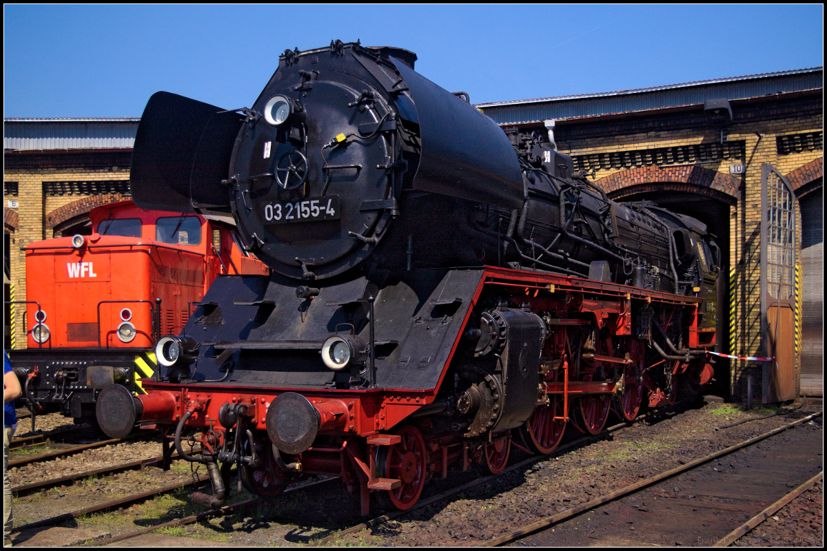 Mit einem Sonderzug, der einmal rund um Berlin fahren sollte, stand DR 03 2155-4 auf dem Vereinsgelände der Dampflokfreunde Berlin e.V. während des 15. Berliner Eisenbahnfest am 15.09.20148 bereit.