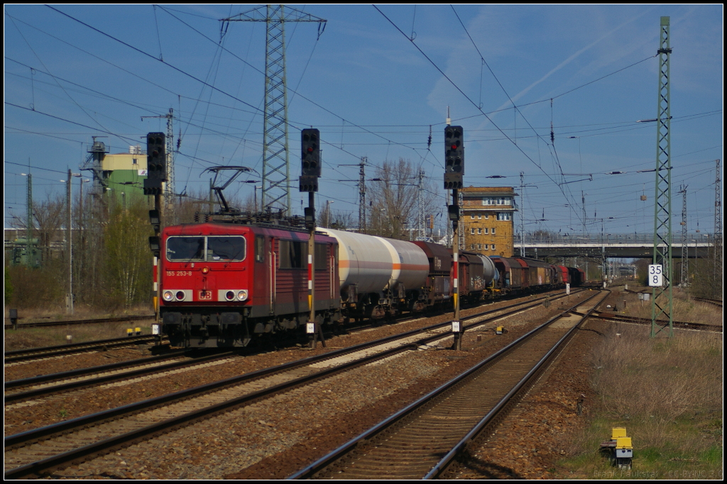 DB Cargo 145 018-8 fuhr mit einem gemischten Güterzug am 09.04.2018 durch die Berliner Wuhlheide.