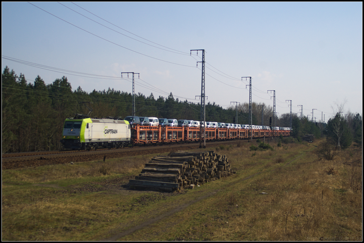 DB Cargo 185 016-3 fuhr mit vielen Kesselwagen am 10.04.2018 durch die Berliner Wuhlheide.
