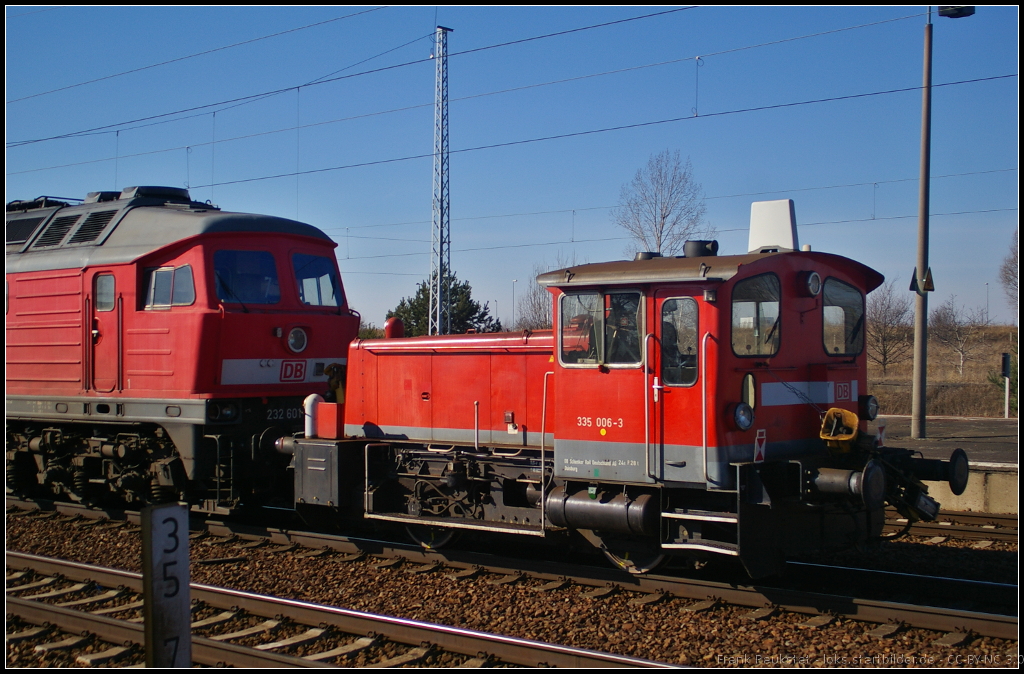 DB Schenker 232 601 mit 335 006 (DB Schenker Rail Duisburg) als ungleiches Paar am 24.02.2014 durch Berlin Schönefeld Flughafen nach Seddin