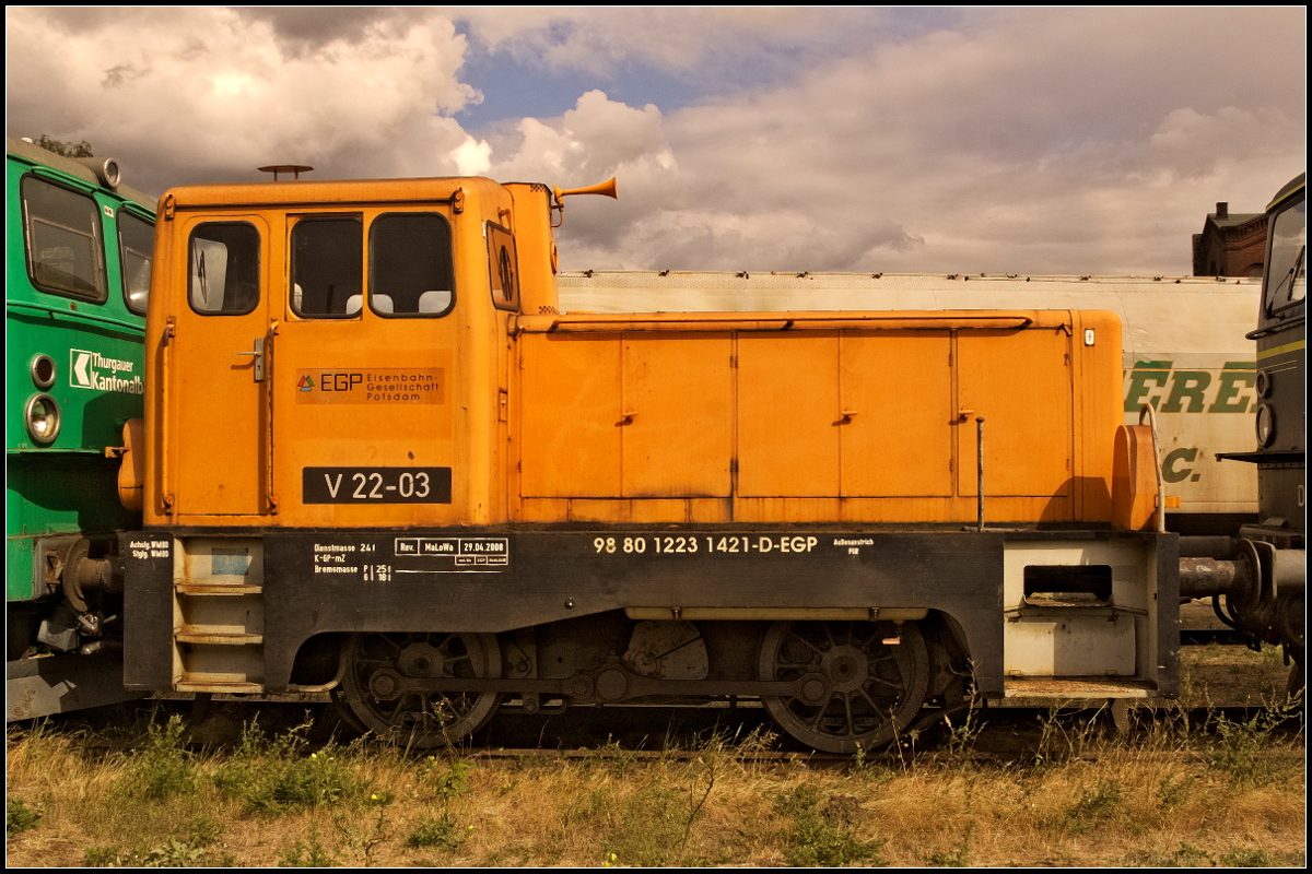 EGP V 22-03 / 223 142-1 stand in Wittenberge mitten zwischen Loks der Baureihe E 42 und abgestellten Güterwagen. Ob die Lok am 25.08.2018 noch fahrtauglich war, konnte nicht festgestellt werden. Interessant ist die NVR-Nummer 98 80 1223 1421 D-EGP. Frank Paukstat