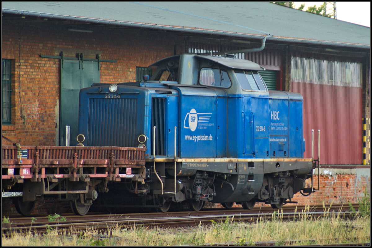 Fast am Ende des Güterschuppens stand EGP 212 314-9 mit einigen Flachwagen in Wittenberge abgestellt. Die Lok trug am 25.08.2018 den Schriftzug 'HBC - Hanseatisches Bahn Contor GmbH'. Frank Paukstat