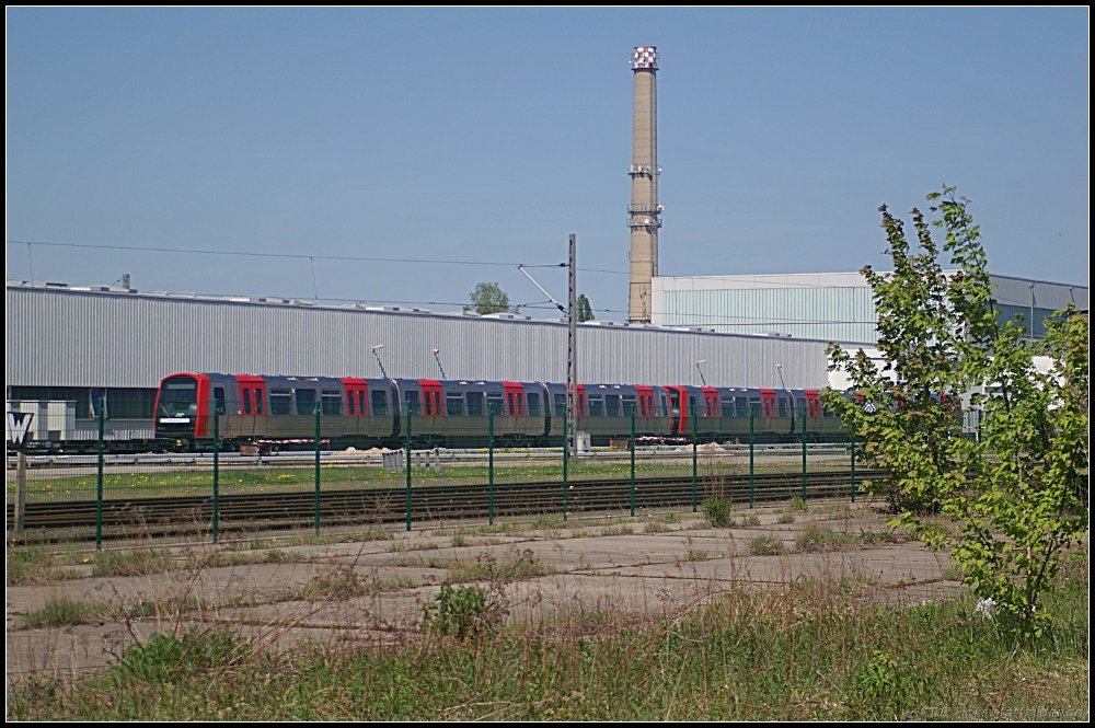 Tz 301 der Hamburger Hochbahn pendelte auf dem Prüf- und Testgleis des Bombardier-Werks. Im Innenraum waren etliche Kabel durch den ganzen Zug gespannt. Auf der Fahrtrichtungsanzeige stand "U2 Niendorf Nord" zu lesen (gesehen Hennigsdorf b. Berlin 16.07.2011)