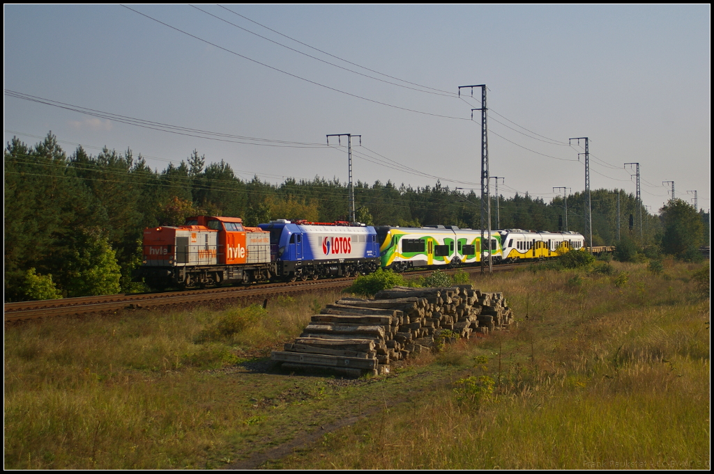 hvle V 160.8 / 203 616-8 mit einer Überführung am 17.09.2014 durch die Berliner Wuhlheide zur InnoTrans 2014: vorne die von Pesa gebaute E6ACT-008 / 3 160 415-8, dahinter 222M-001 / 2 720 073 und am Ende 36WEa-011A