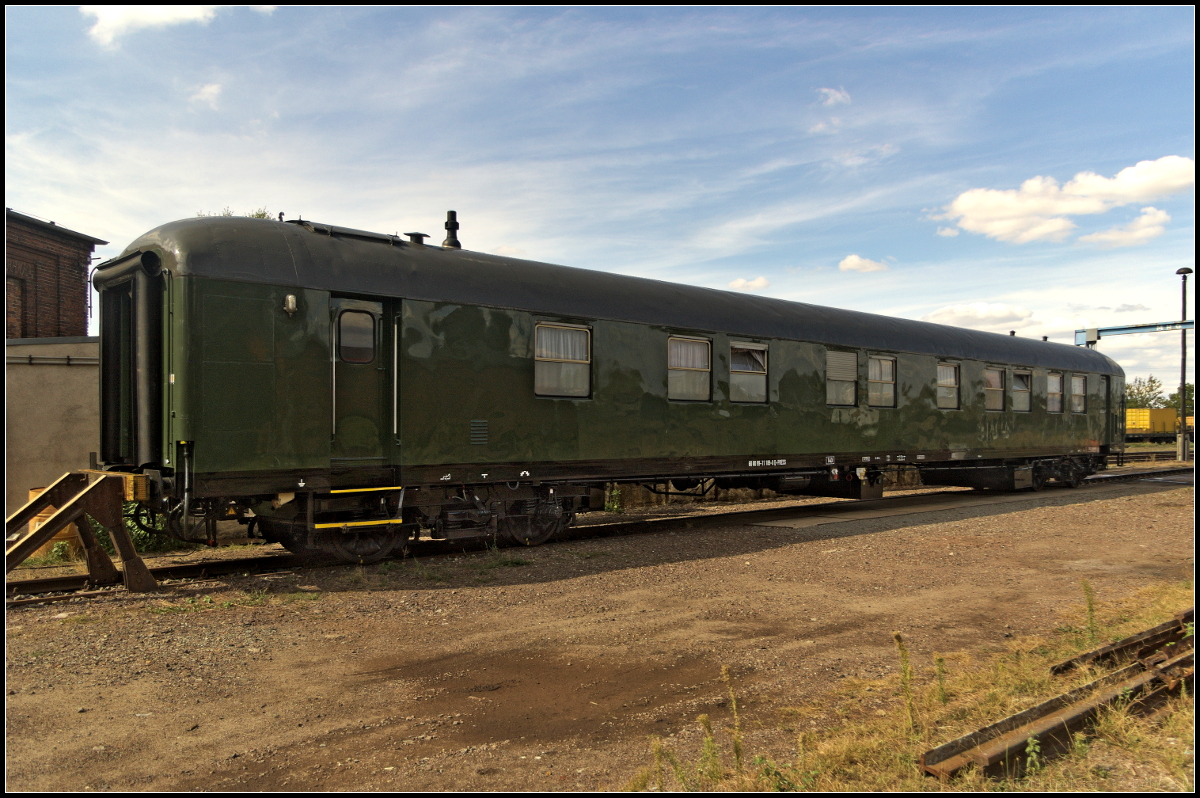Mit einem Holzzug am Haken kam die schöne PRESS 145 023 / 145 083-2, die Werbung für '120 Jahre Rasender Roland' machte, am 27.05.2017 durch die Berliner Wuhlheide gefahren