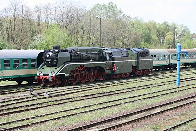 Mit einem Sonderzug, an deren Ende 35 1019-5 läuft, kommt die Lok zum 11. Berliner Eisenbahnfest auf das Festgelände gefahren. Die Lok wurde 1940 vom Hersteller BLW an die DRB ausgeliefert. 1974 erfolgte in Meiningen der Umbau auf Ölfeuerung. 1981 wurde dann im Raw Meiningen auf Rostfeuerung umgerüstet. Die Lok ging 1996 zum DB Museum Nürnberg. Inzwischen ist sie im Besitz der Dampf-Plus GmbH (NVR-Nummer 90 80 0013 010-8 D-HLP)