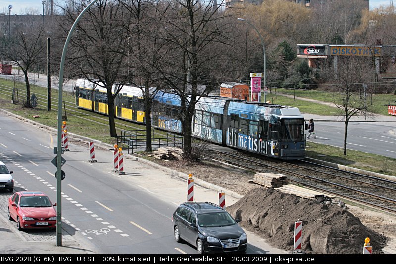 BVG 2028 (Typ GT6N)  BVG für Sie 100% Klimatisiert...  (Berlin Greifswalder Str, 20.03.2009).