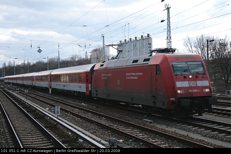 DB Fernverkehr 101 051-1 "Unsere Züge schonen die Umwelt..." mit CD-Kurswagen (Berlin Greifswalder Str, 20.03.2009).