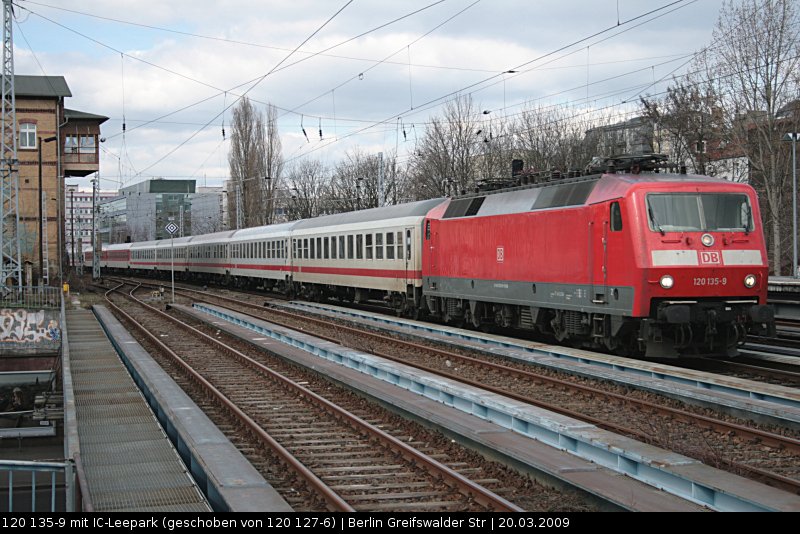 DB Fernverkehr 120 135-9 mit IC-Leerpark, geschoben wird von DB 120 127-6 Richtung Rummelsburg (Berlin Greifswalder Str, 20.03.2009).