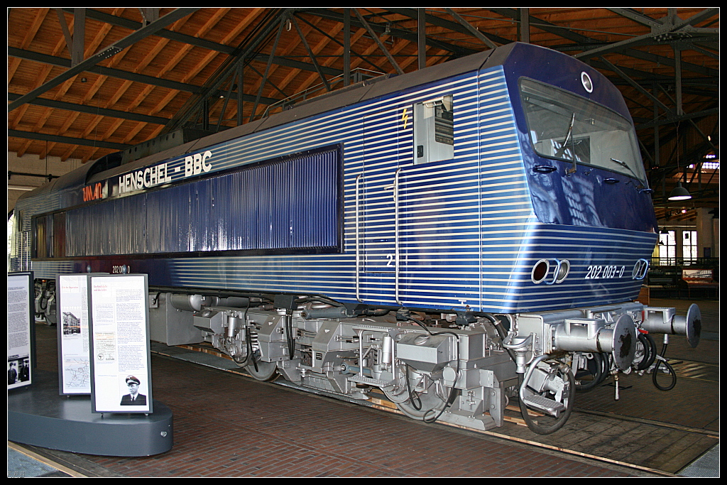DB 202 003-0 ist eine Versuchsdiesellok für die Vorversuche zum ICE (Intercity Experimental) mit Geschwindigkeiten bis zu 250 km/h. Von der Lok wurden drei Stück gebaut. Die Lok war bis 1985 im Betriebseinsatz. Das Bild zeigt die Lok mit der Stromschale vor dem Führerstand (Deutsches Technikmuseum Berlin 18.04.2010)
