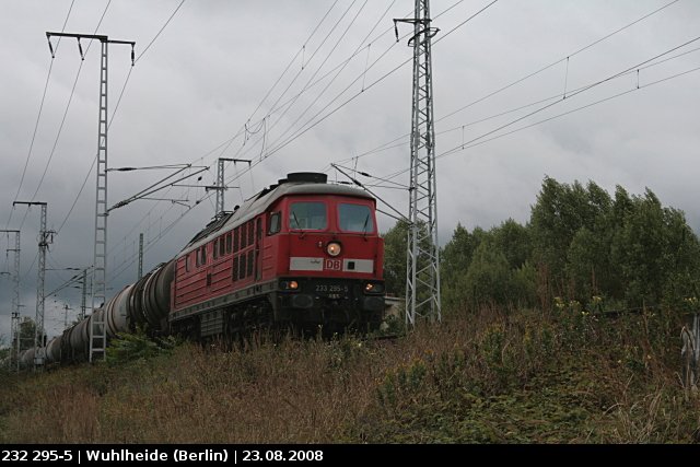 DB 232 295-5 (inzwischen umbenannt zu 233 295-5) mit Kesselzug bringt eine große Regenfront mit (Berlin Wuhlheide, 23.08.2008)