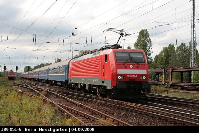 189 051-6 (ohne Logo) mit dem Nachtzug nach Kiev (Class 189-VA, Railion Deutschland AG, gesichtet Berlin Hirschgarten, 04.09.2008).