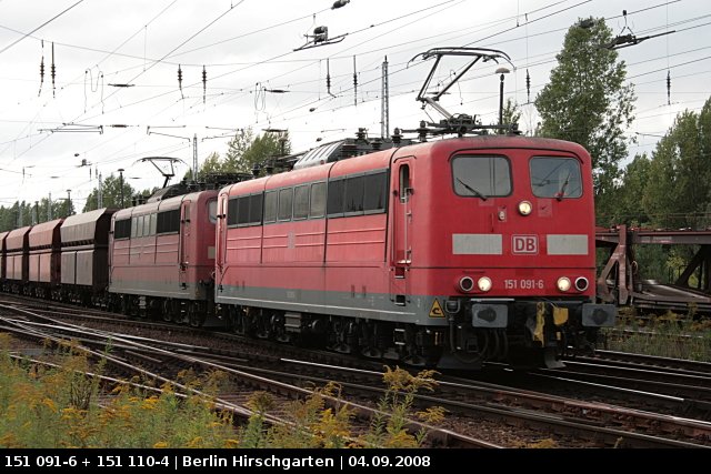 DB 151 091-6 und 151 110-4 mit Schüttgut in Berlin Hirschgarten, 04.09.2008