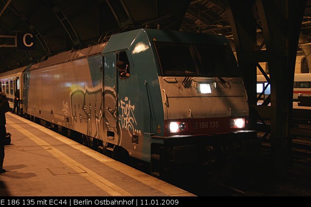 DB Fernverkehr E 186 135 mit dem Berlin-Warschau-Express ist etwas zu dunkel geraten im Bahnhof (DB Fernverkehr AG Frankfurt (Main), NVR-Nummer: 91 80 6186 135-0 D-DB, gesichtet Berlin Ostbahnhof 11.01.2009).