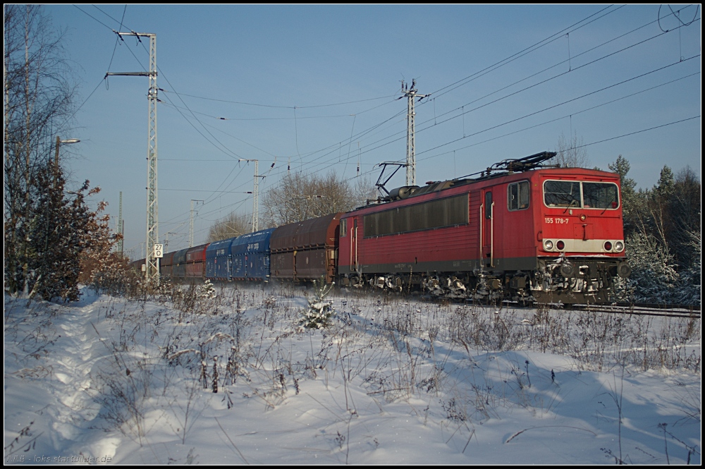 Für CTL ist ER 20-002 / 223 002 im Einsatz und zieht am 18.12.2010 den "Waschmaschinenzug" durch die verschneite Berliner Wuhlheide.