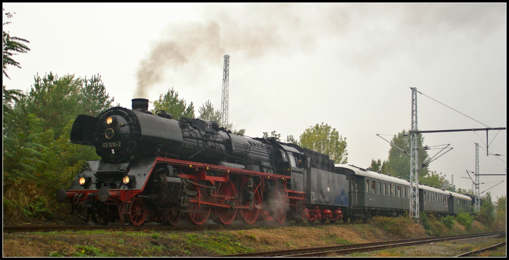 Seit der HU Anfang Juli 2011 hat 03 1010 bereits etliche Kilometer mit Sonderzügen zurückgelegt. Bei extrem tristen Wetter mit Dauerregen kam die Lok am 30.07.2011 mit dem DPE 1859 aus Hannover nach Berlin, hier auf Höhe des beliebten Fotostandorts mit dem Stellwerk Greifswalder Straße. Gruß an die Tf und Mitreisenden!